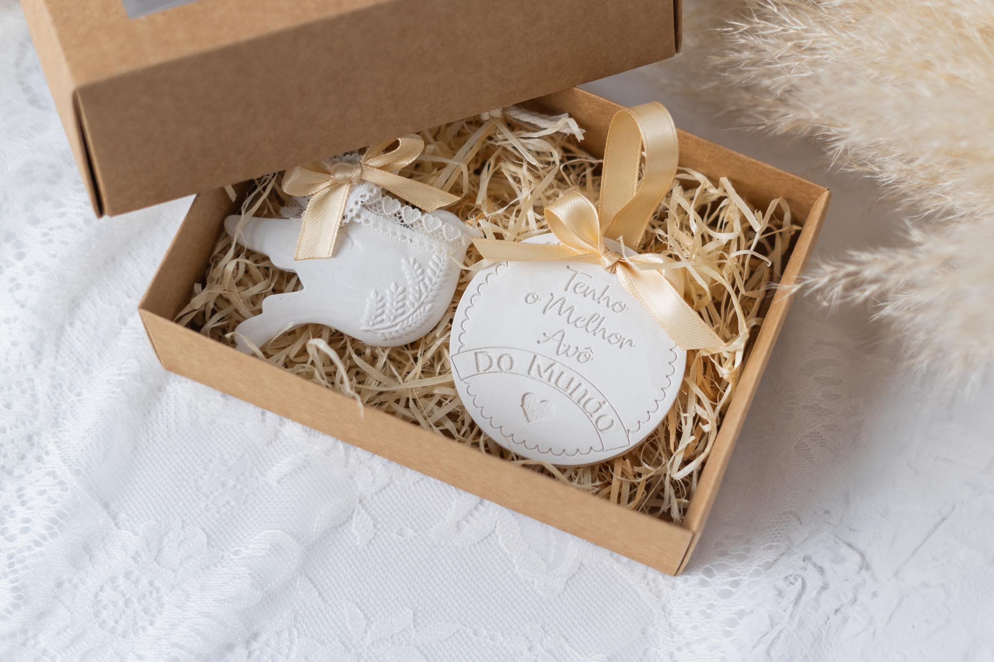 Perfeita para oferecer num batizado ou comunhão ao avô, este conjunto faz par com as nossas pombas em gesso perfumado.