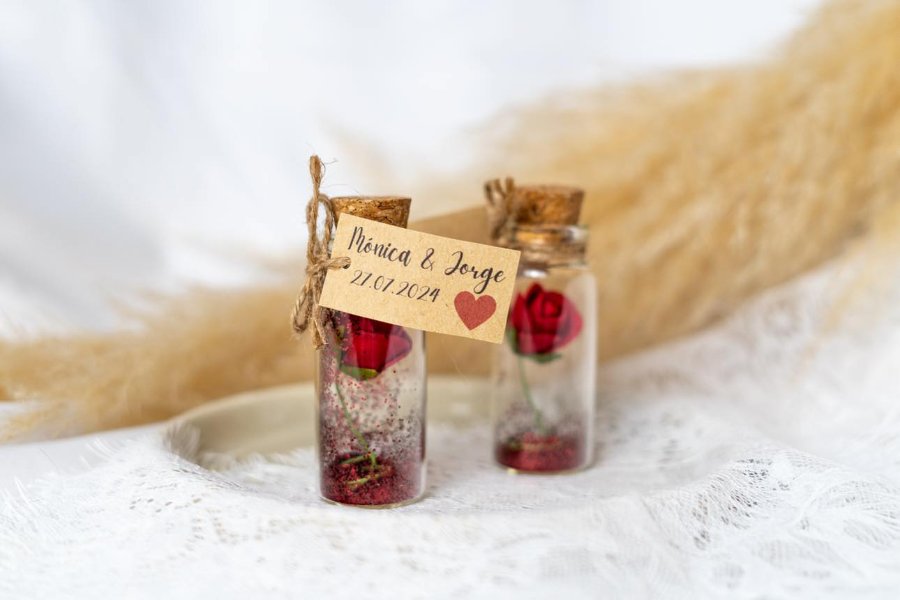 Surpreende os teus convidados no dia do teu casamento com este Frasco Com Rosa Vermelha como Lembrança de Casamento!