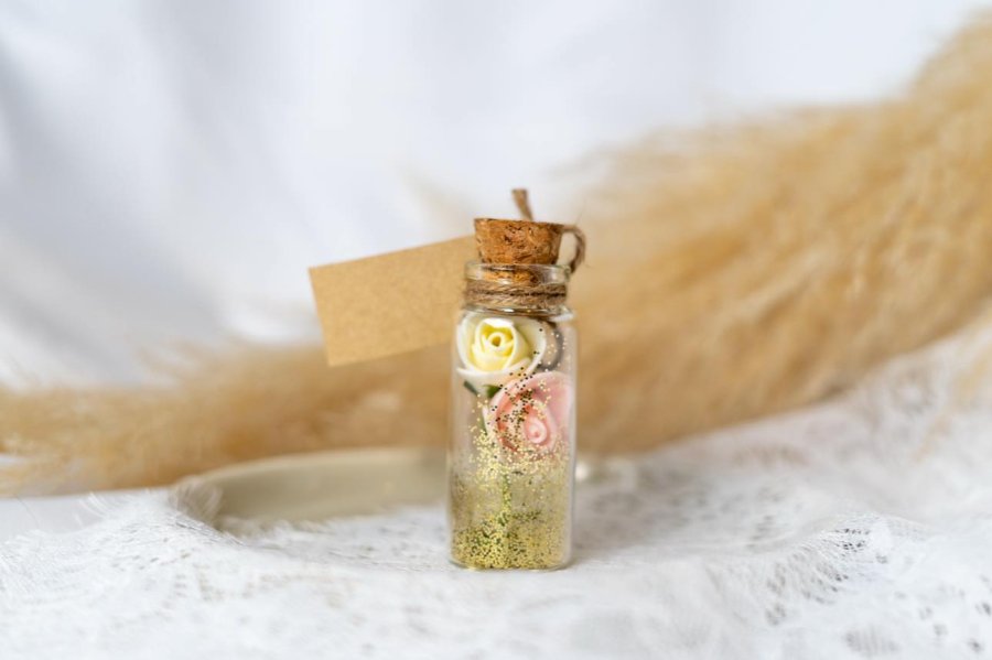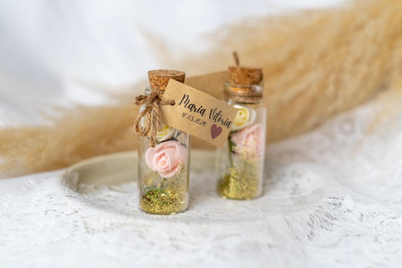 Por outro lado, as flores simbolizam carinho, amor e alegria, o que transforma este frasco numa recordação cheia de significado e emoção para quem a recebe.