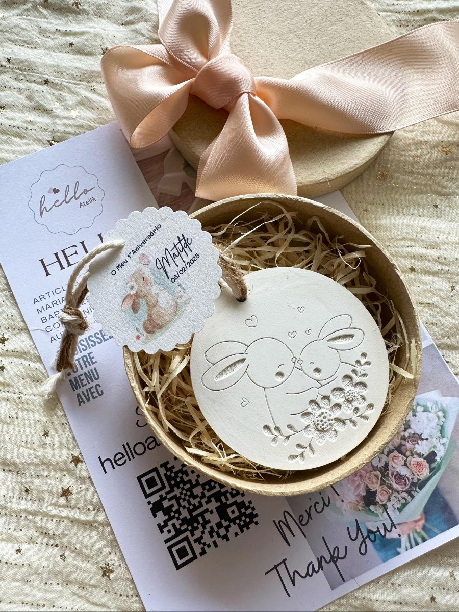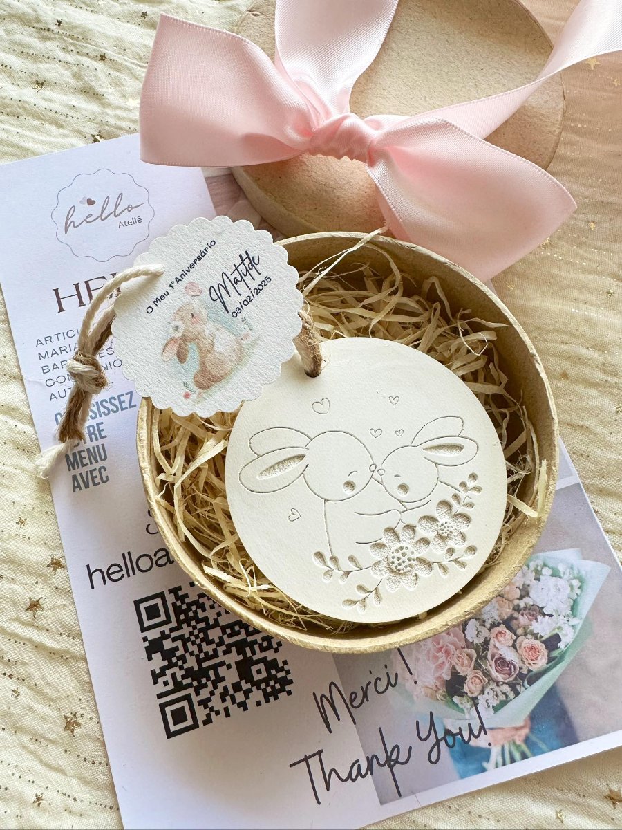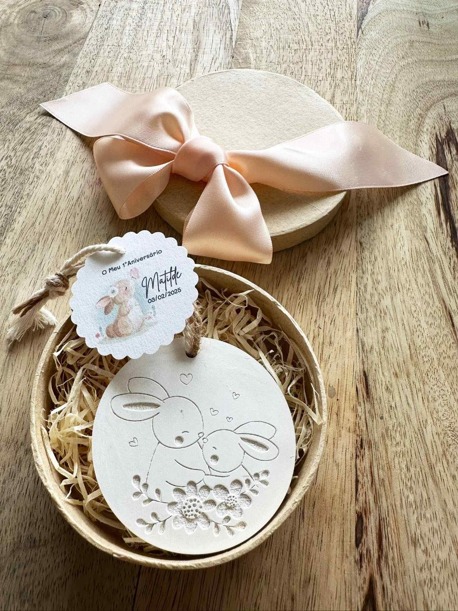 A Medalha em Gesso Perfumado Coelhos é uma lembrança encantadora e cheia de ternura, perfeita para agradecer de forma especial. Com um design delicado inspirado em coelhinhos, este artigo artesanal transmite alegria, carinho e o amor.