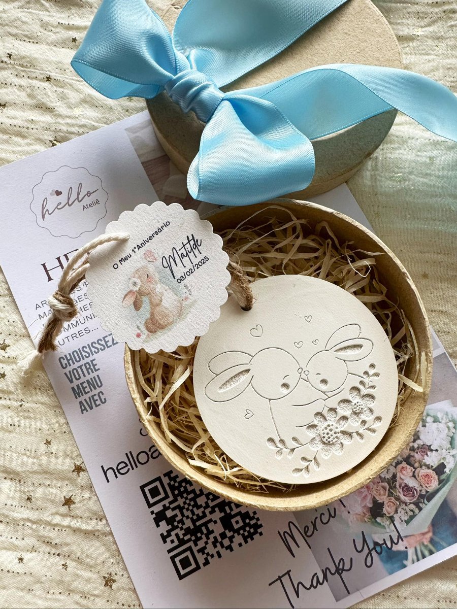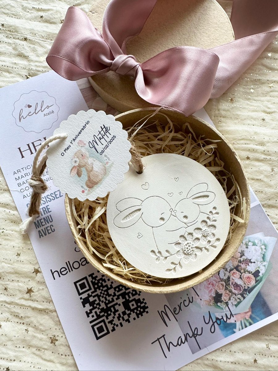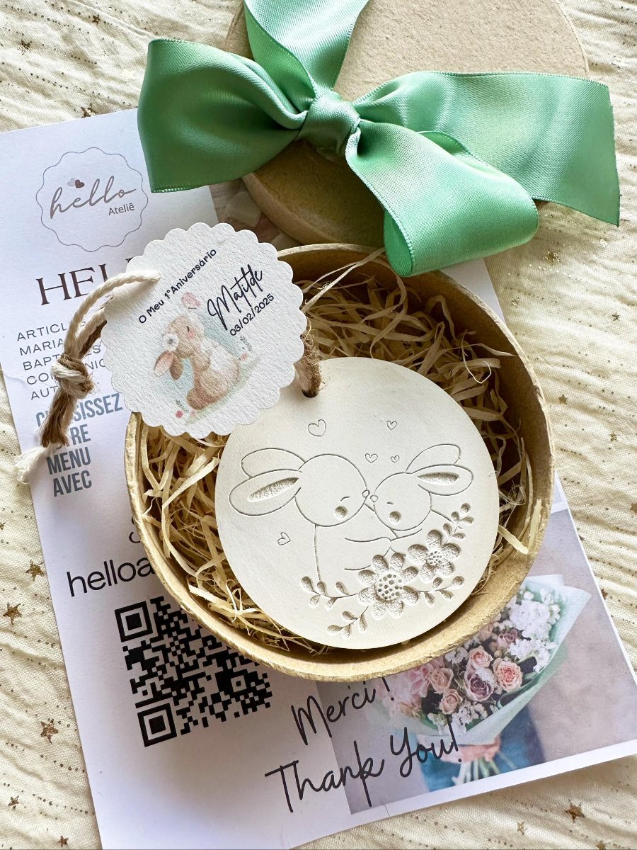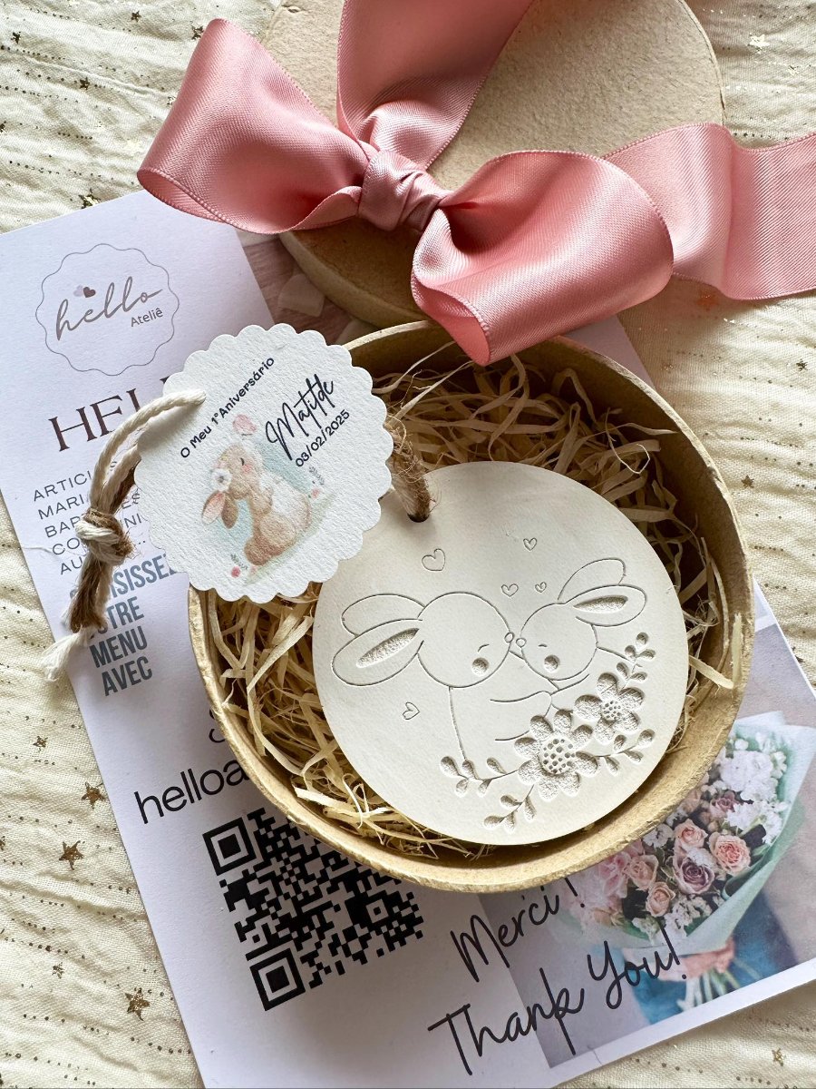 A Medalha em Gesso Perfumado Coelhos é uma lembrança encantadora e cheia de ternura, perfeita para agradecer de forma especial. Com um design delicado inspirado em coelhinhos, este artigo artesanal transmite alegria, carinho e o amor.