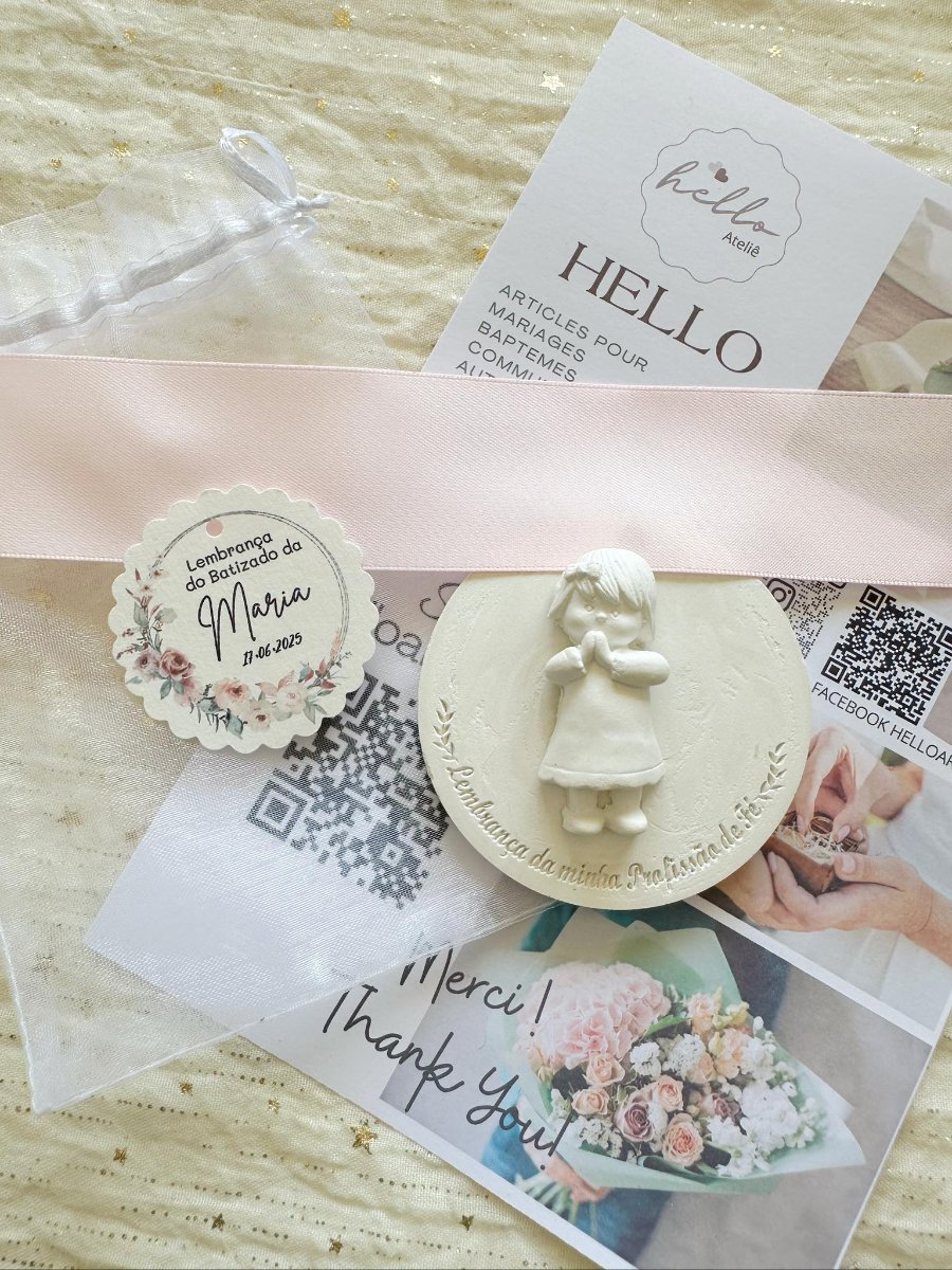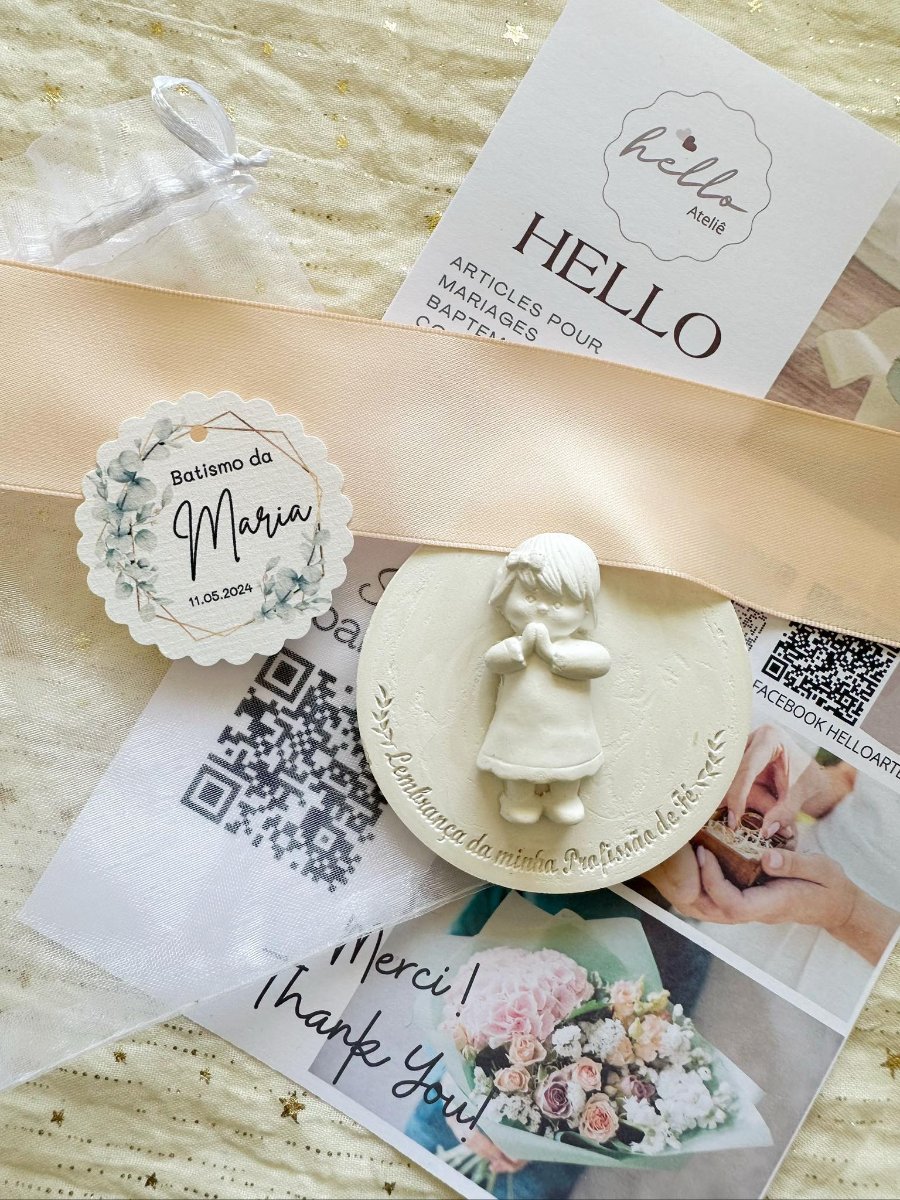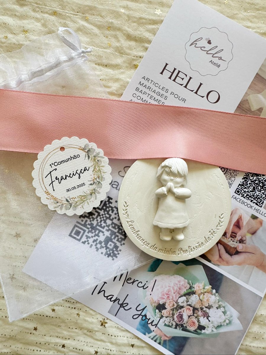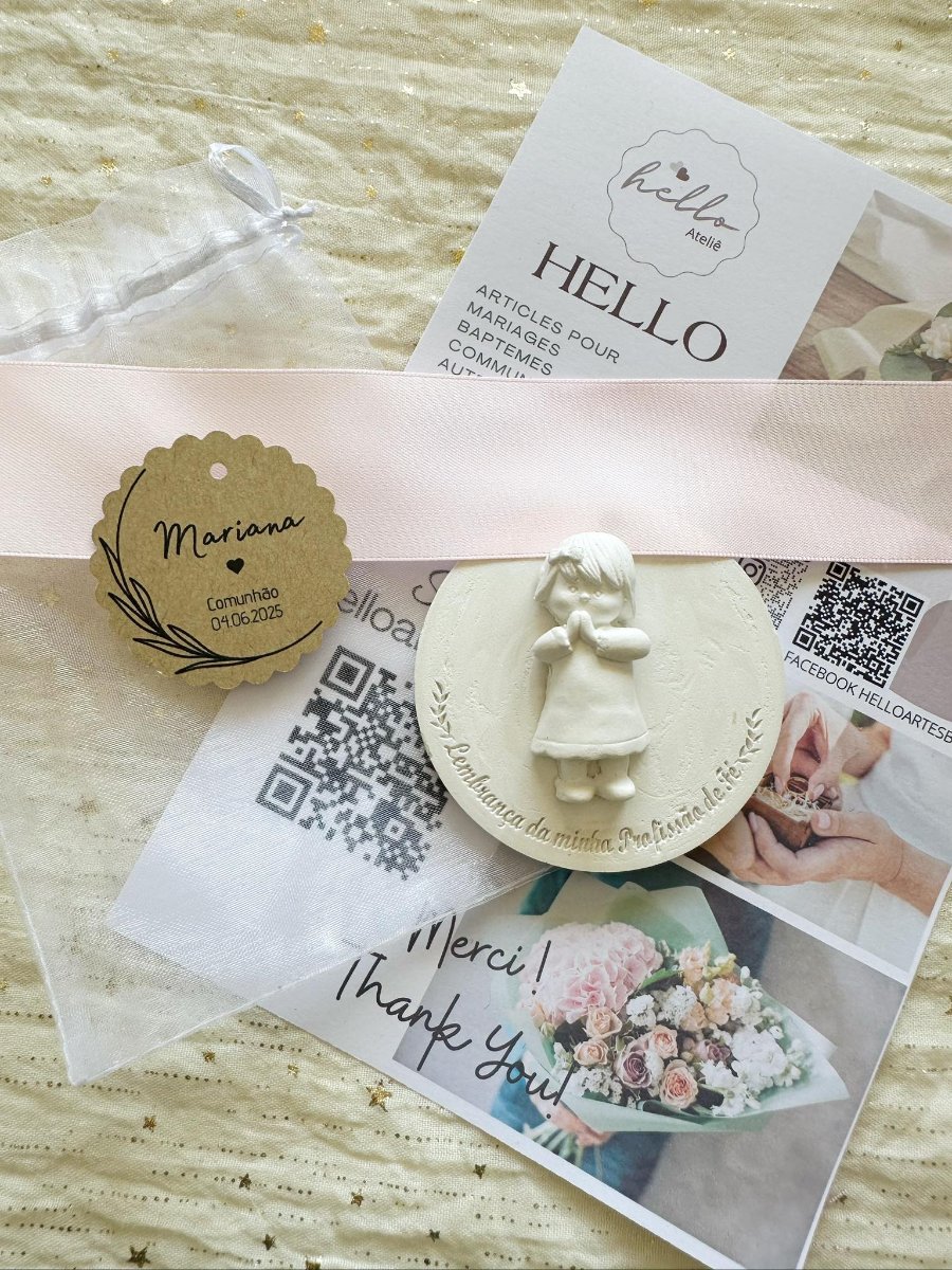 Esta Lembrança foi selecionada e criada especialmente pela HELLO só para sí! Criada à mão por nós, esta lembrança de Profissão de Fé transborda um cheirinho a Talco, que todos os seus convidados vão adorar!