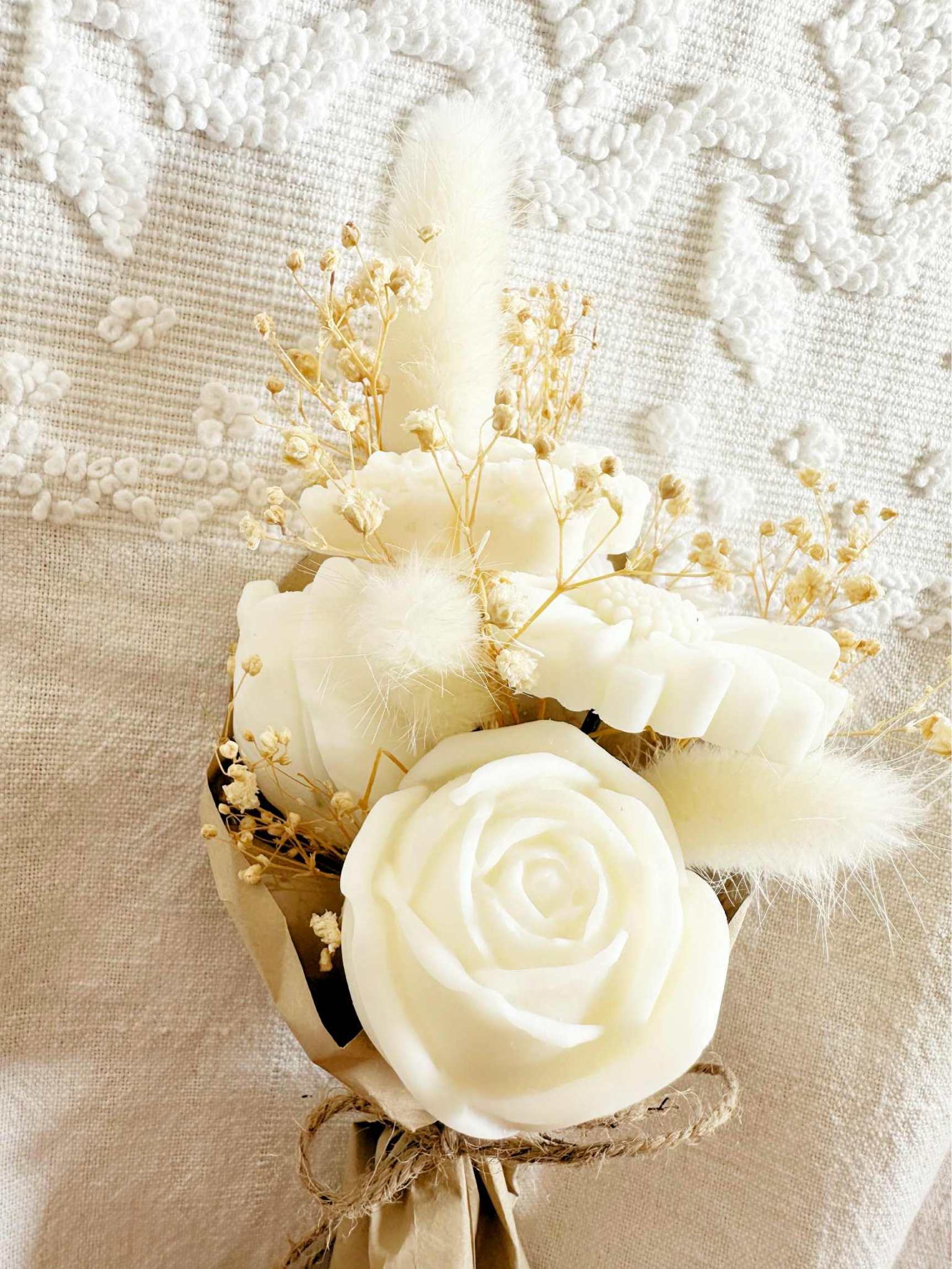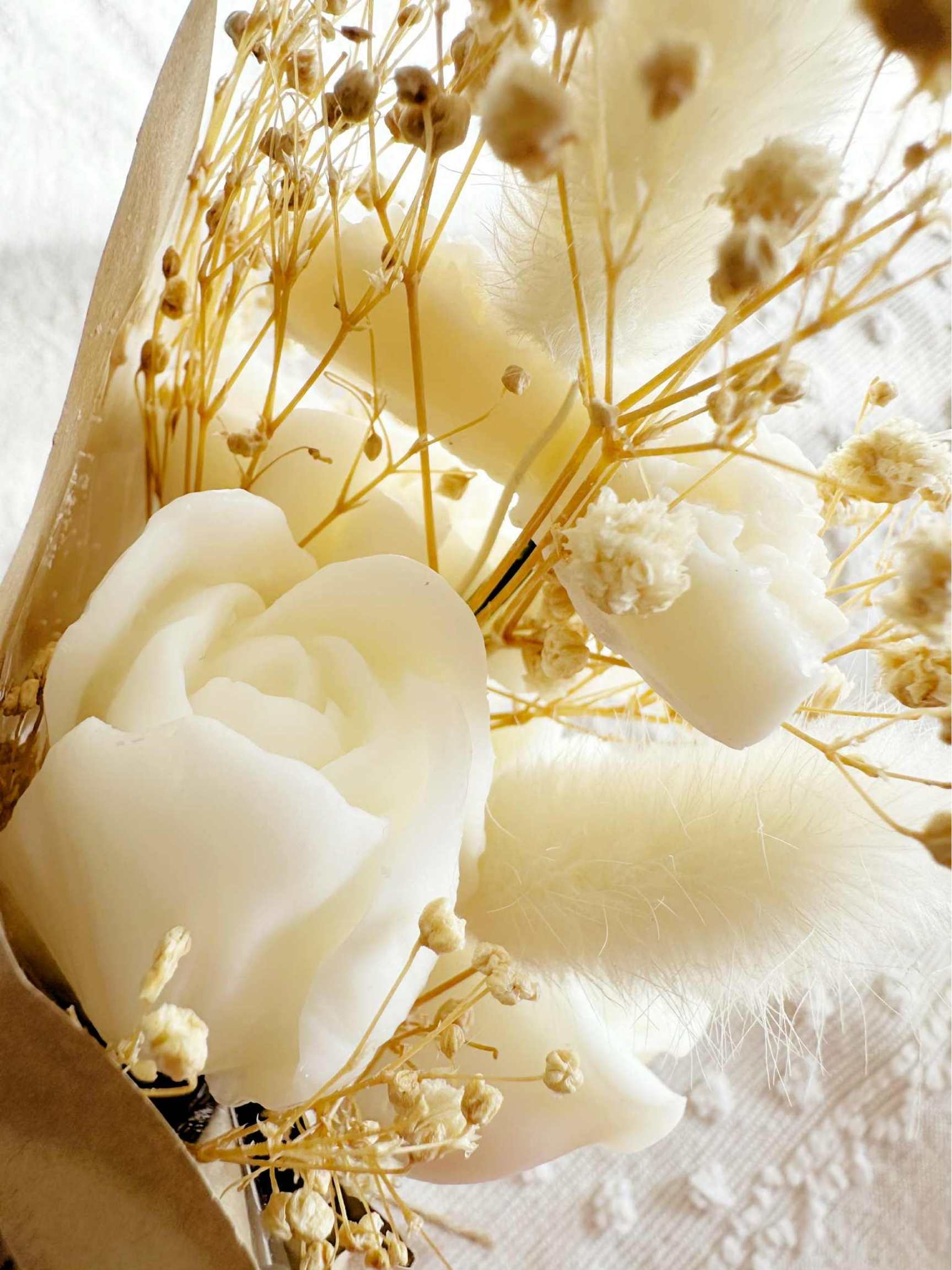 Produzido com flores em cera artesanal, este mini ramo destaca-se pelo seu aspeto realista e pela sua resistência, sendo perfeito para quem procura uma alternativa duradoura às flores naturais.