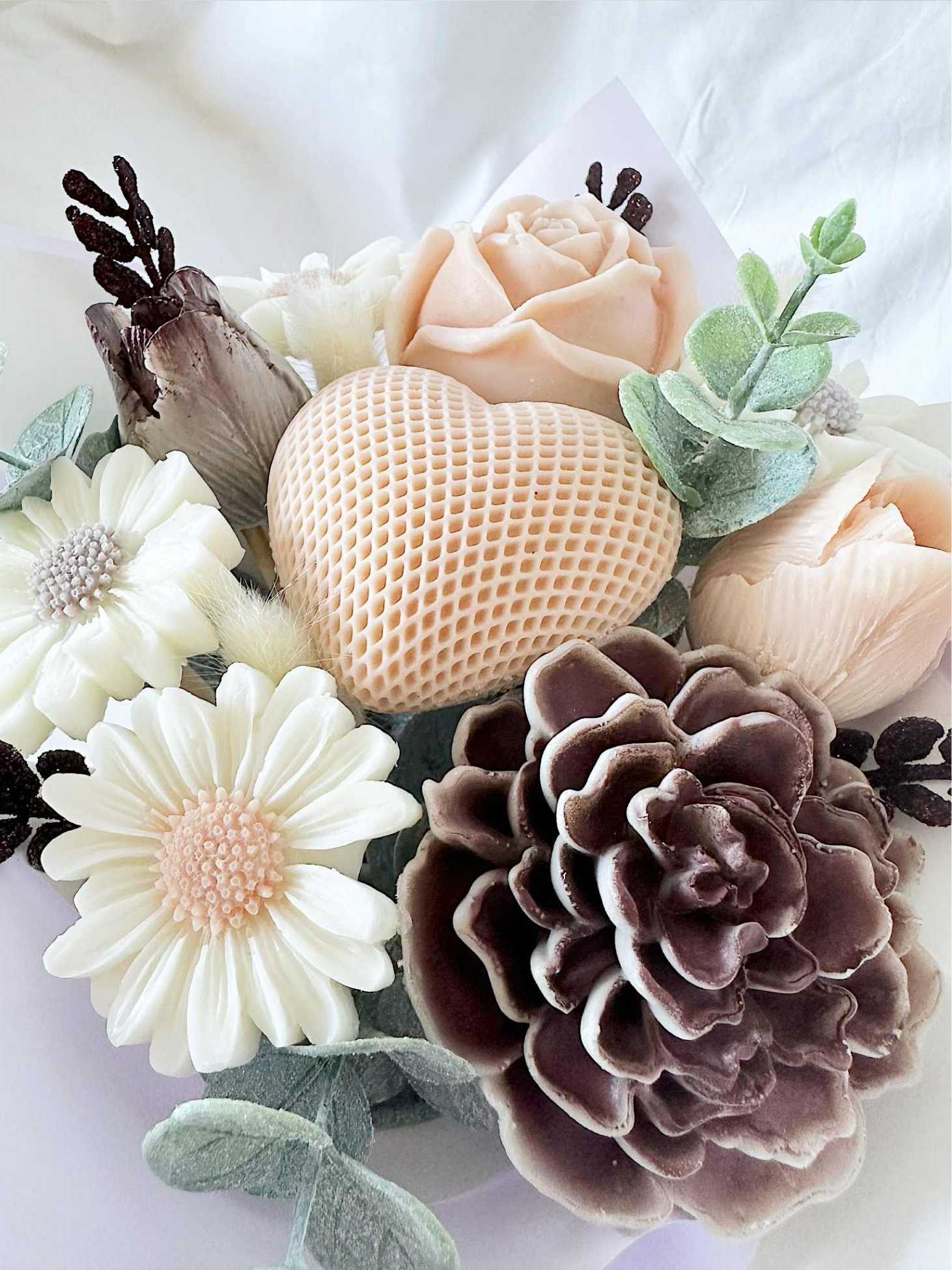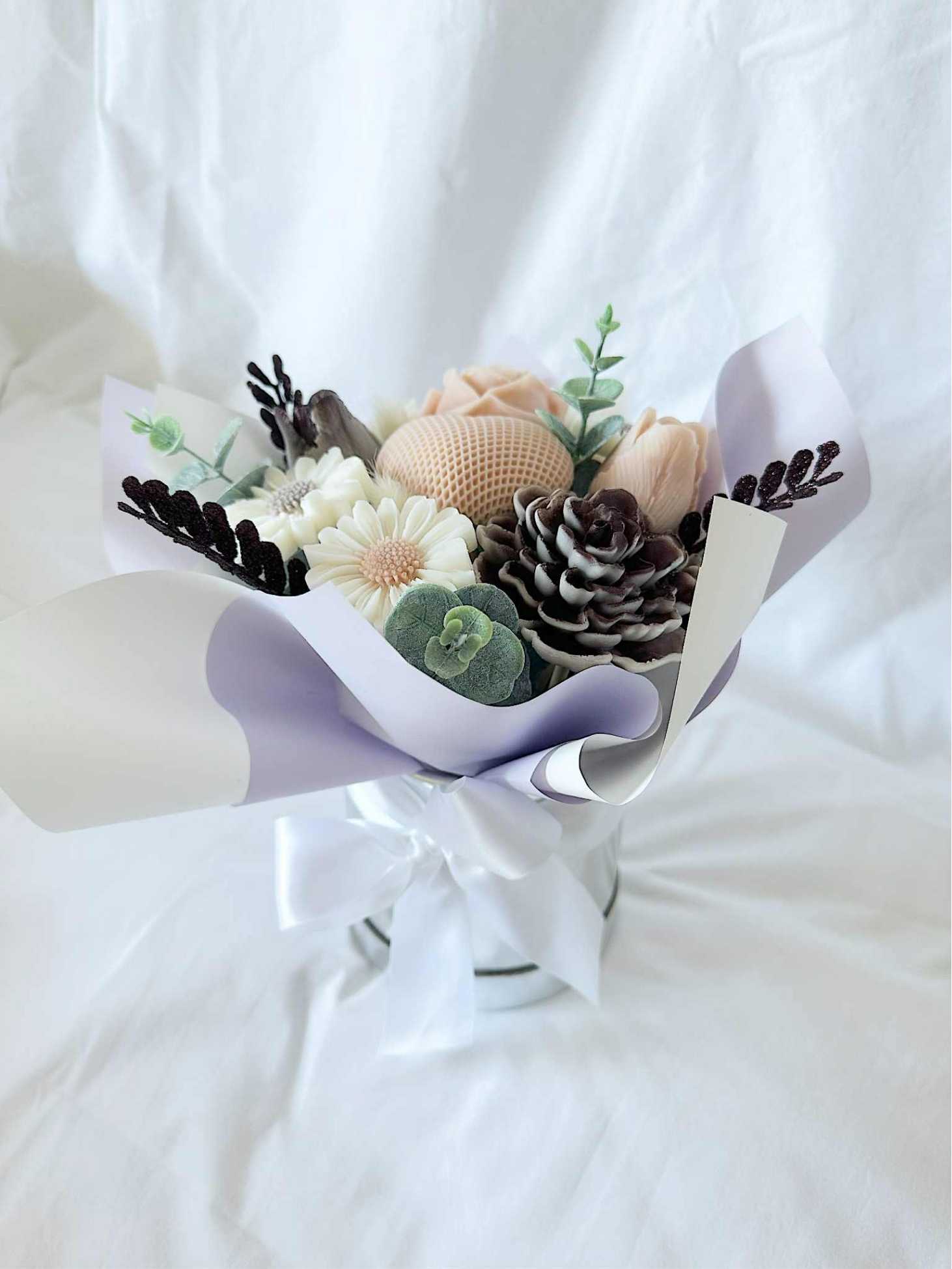 Um arranjo artesanal com flores em cera perfumada que combina estética delicada com uma fragrância suave de talco, pensado para encher ambientes com beleza e perfume. O Presente ideal para oferecer no Dia das Madrinhas ou no Dia da Mãe!